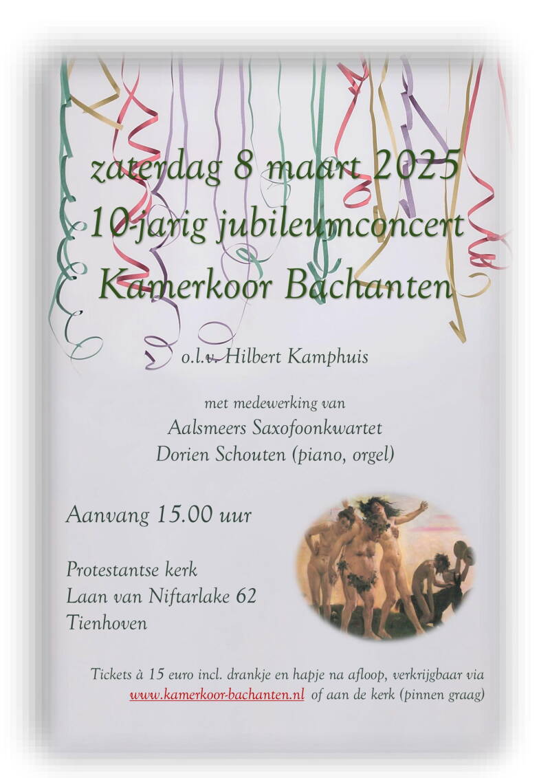 Op woensdag 31 mei luidden de Bachanten onder leiding van Maarten van der Bijl met een gevarieerd programma de zomer in, met Italiaanse, Engelse, Franse en Duitse liederen uit de renaissance en romantiek, afgewisseld door pianostukken van Eric Satie. Het concert vond plaats in De Ark in Duivenkamp in Maarssenbroek. Na afloop werd er onder het genot van een glaasje nagepraat. Kamerkoor Bachanten, opgericht in 2014, viert in 2024 zijn tweede lustrum!